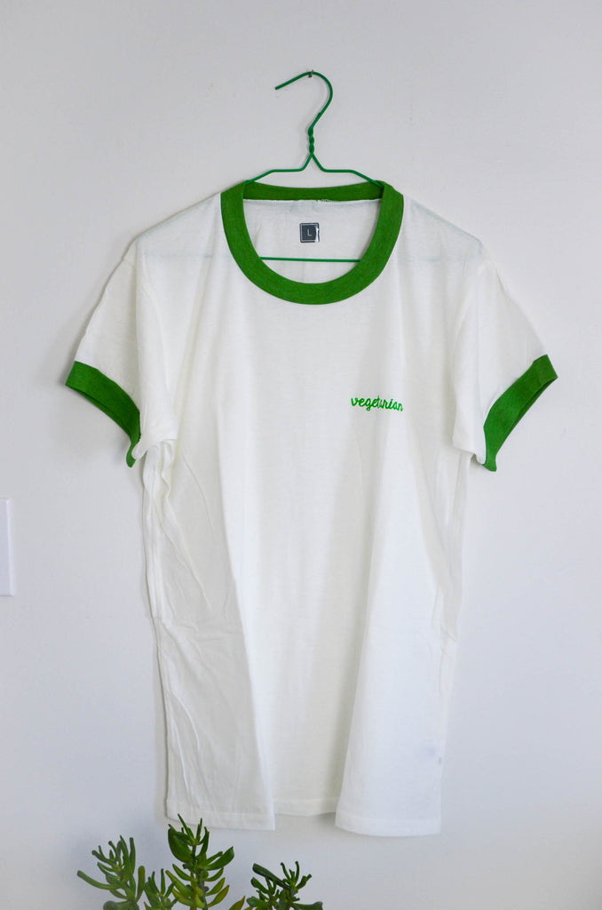 Kelly green ink screen printed by hand onto a Camp Collection ringer t-shirt to say "vegetarian". A subtle print for when you're proud of your commitment but aren't looking to cause a ruckus.
